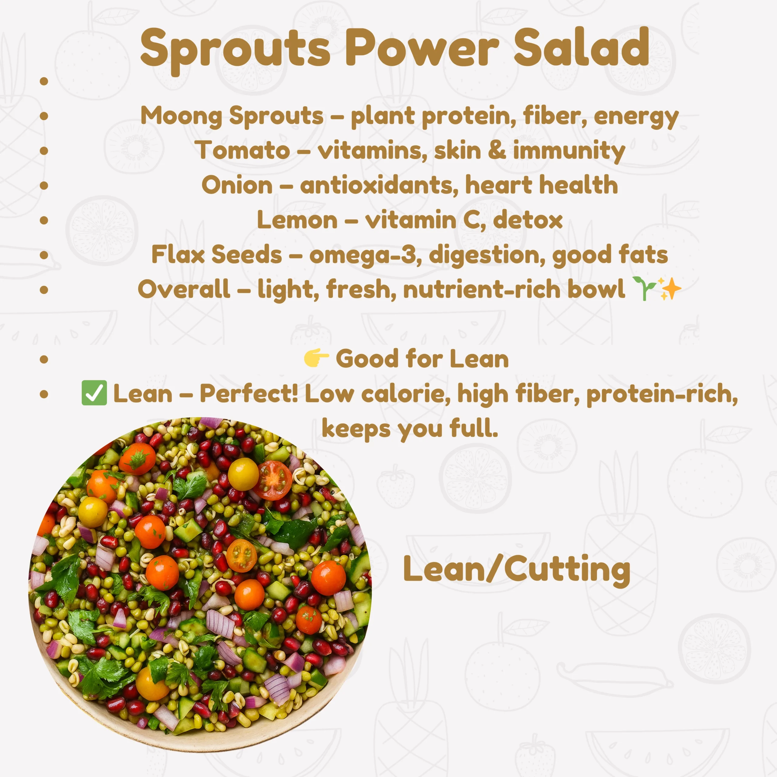 Flax Seeds – omega-3, digestion, good fats Overall – light, fresh, nutrient-rich bowl fit